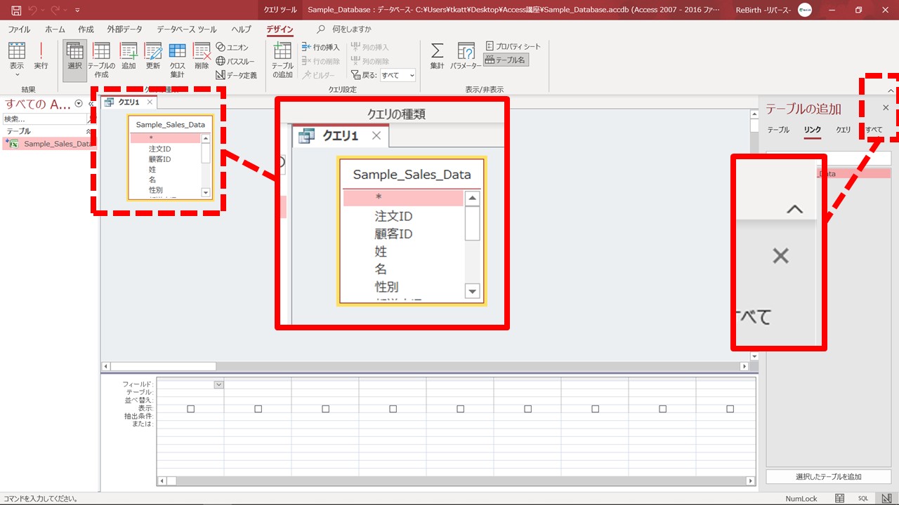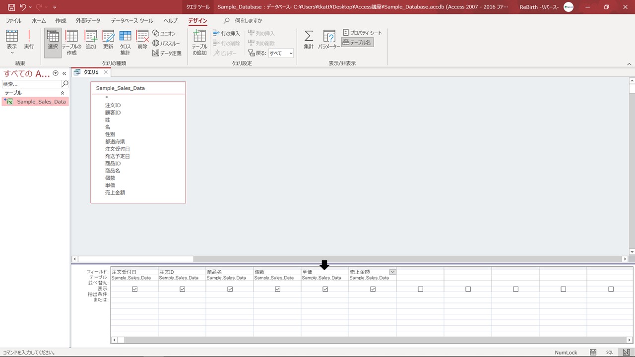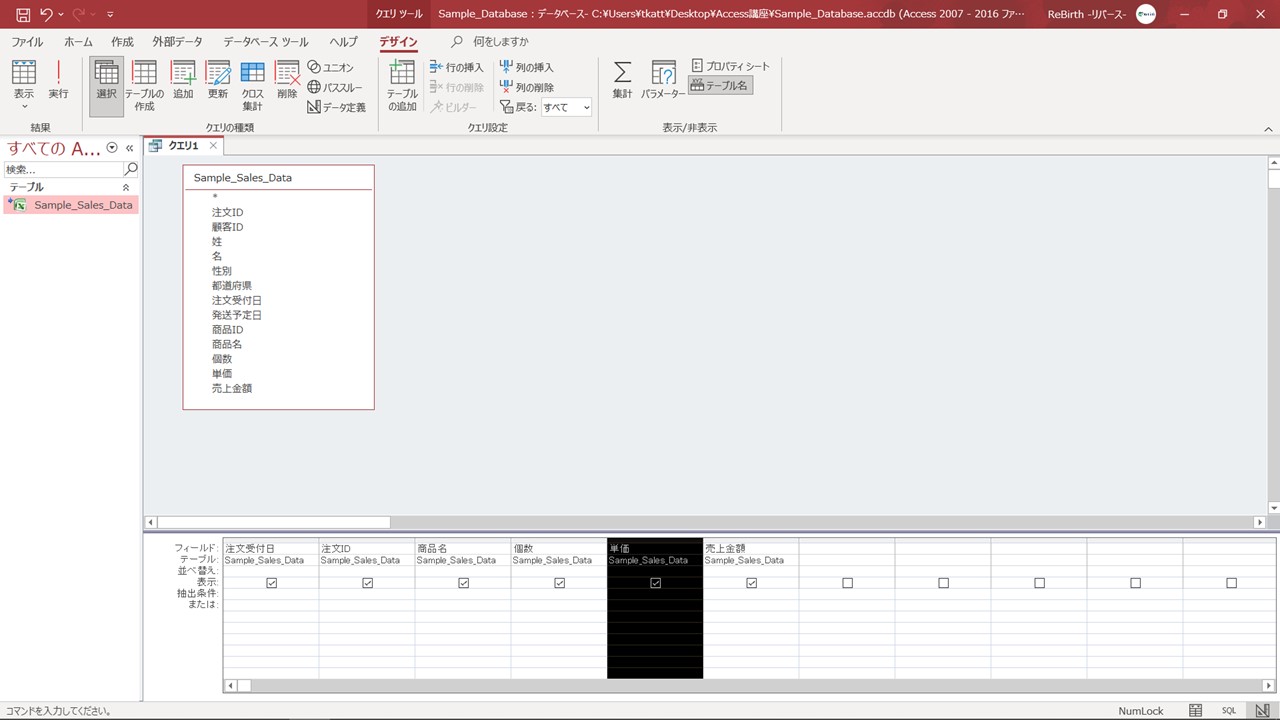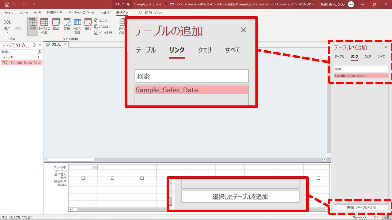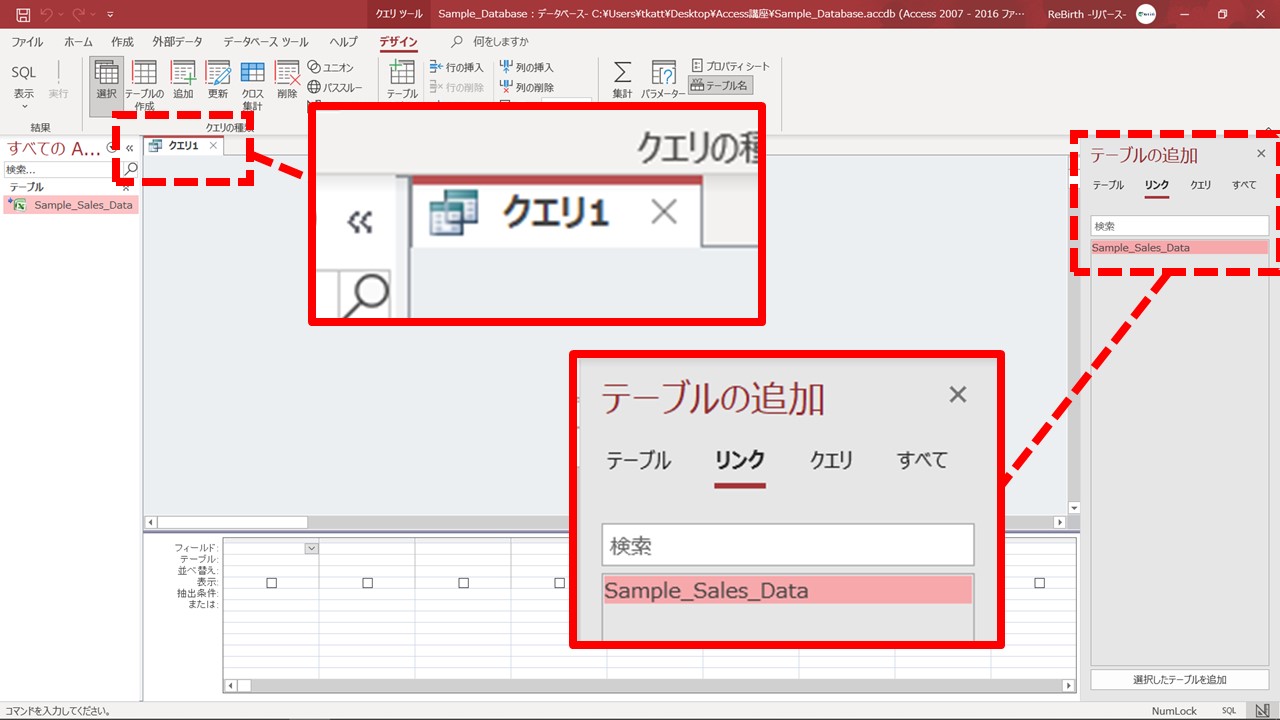 それでは、前回Excelデータをリンクさせた「Sample_Database.accdb」にクエリを作成していきます。