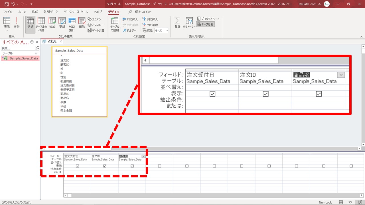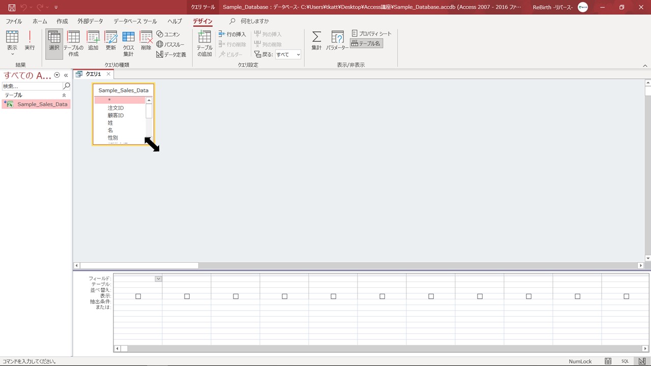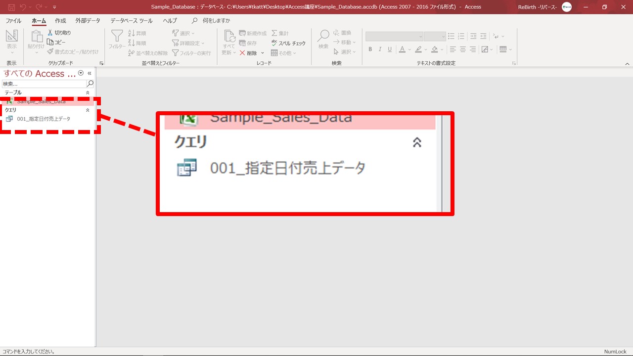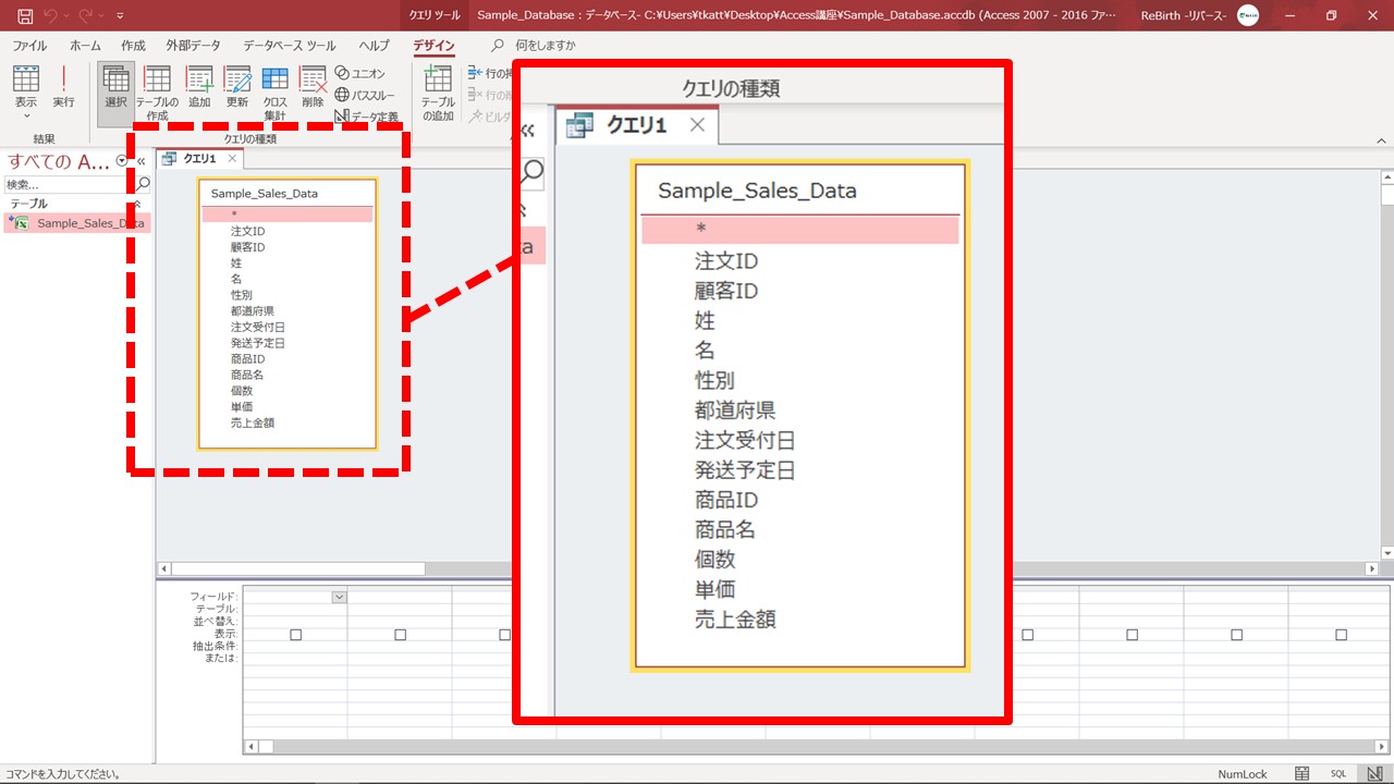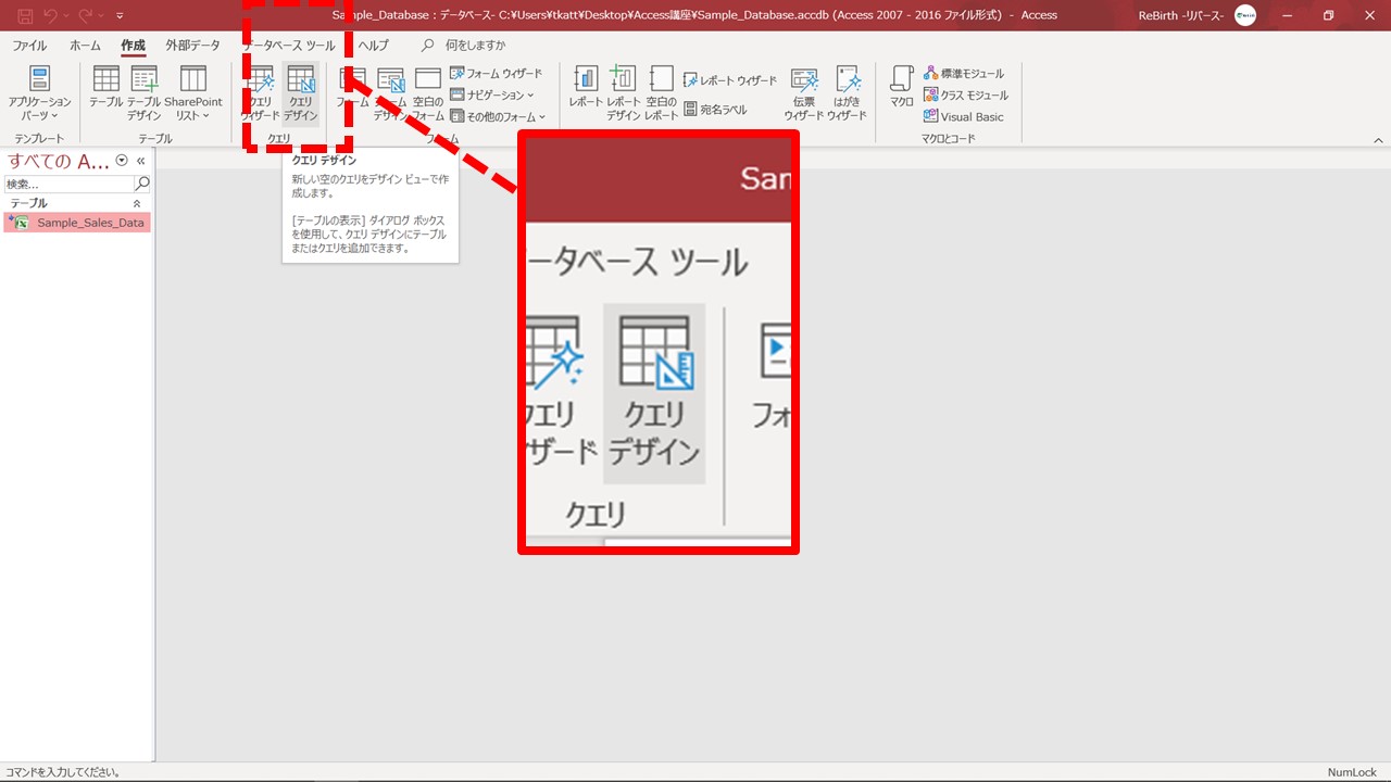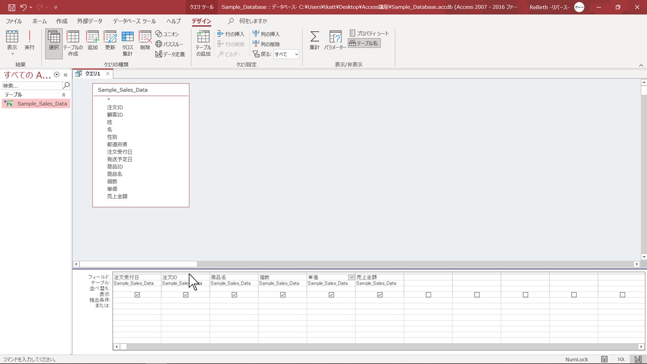それでは、前回Excelデータをリンクさせた「Sample_Database.accdb」にクエリを作成していきます。