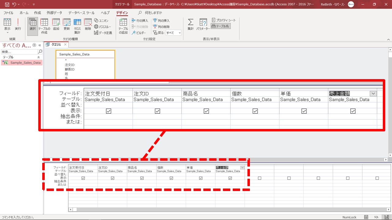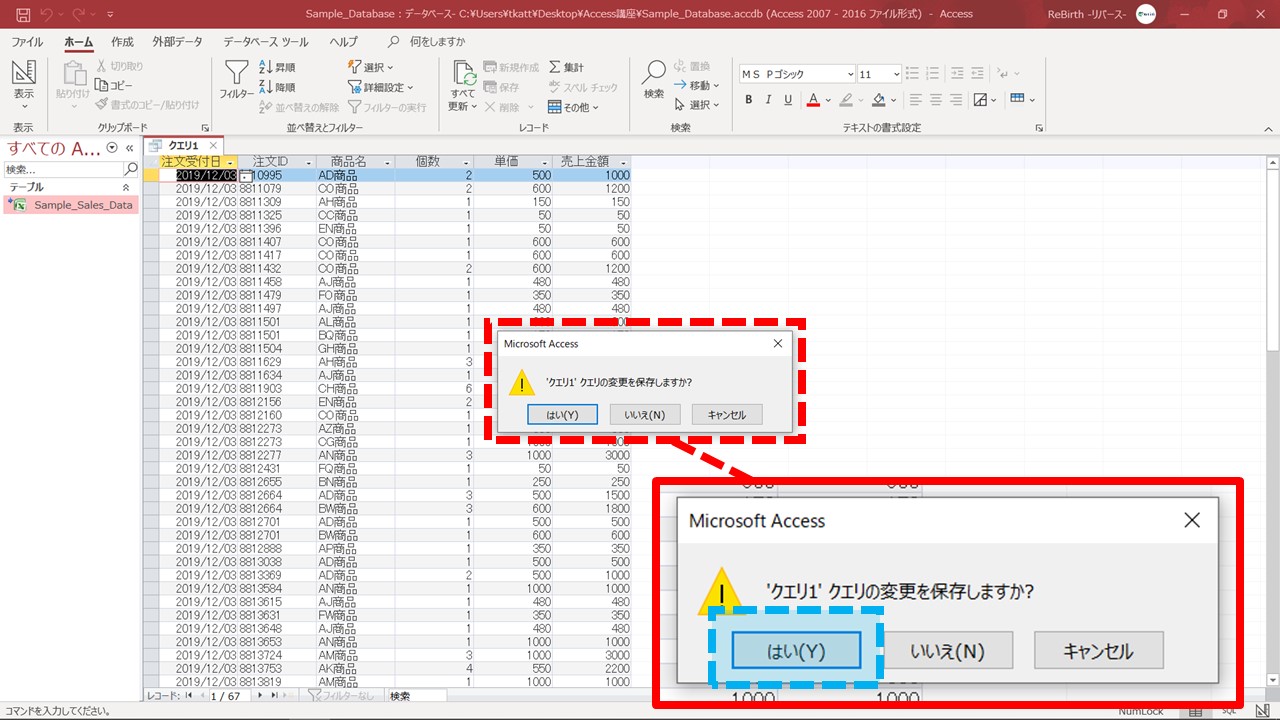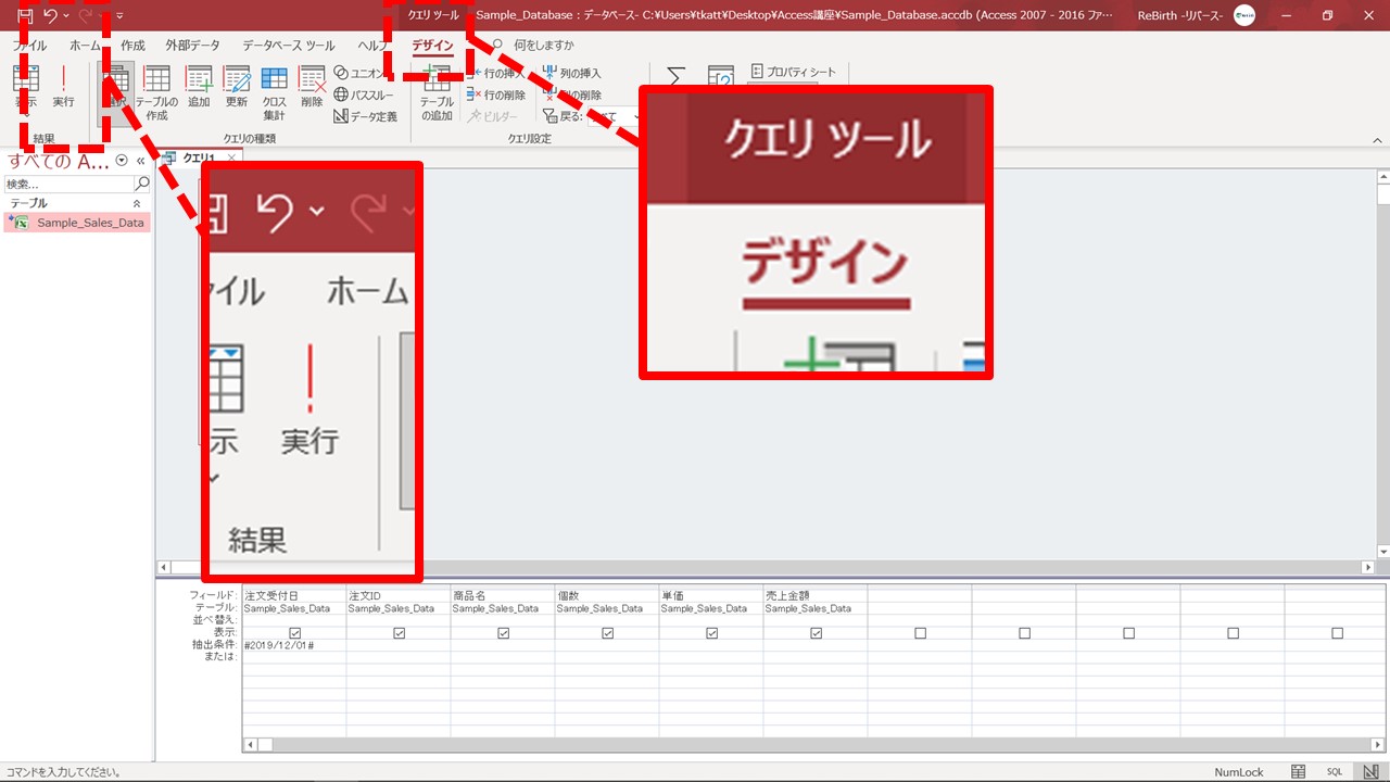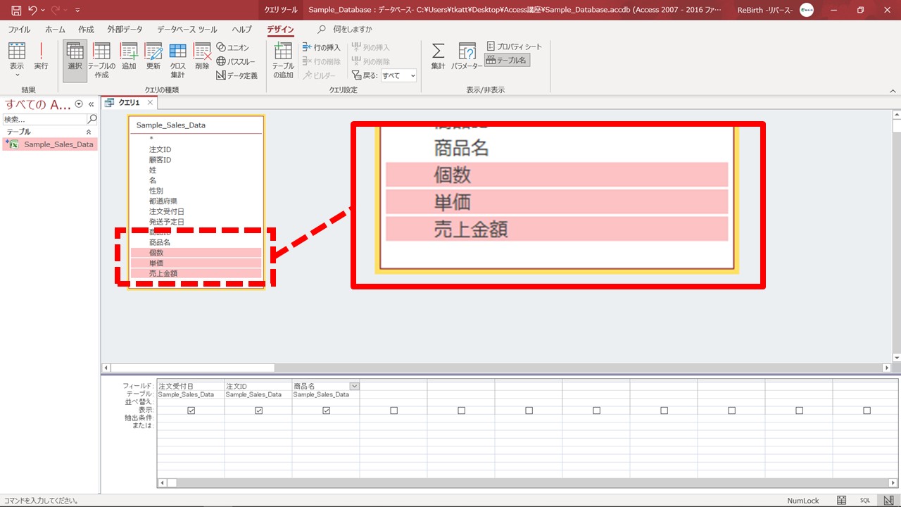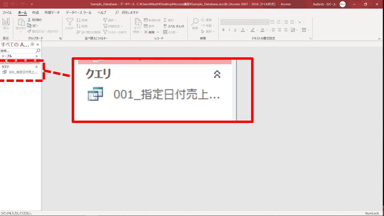 それでは、前回Excelデータをリンクさせた「Sample_Database.accdb」にクエリを作成していきます。