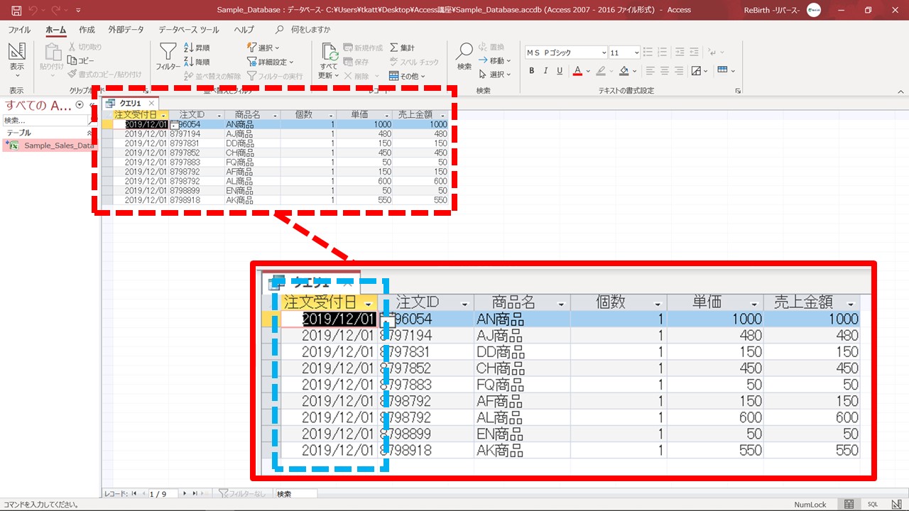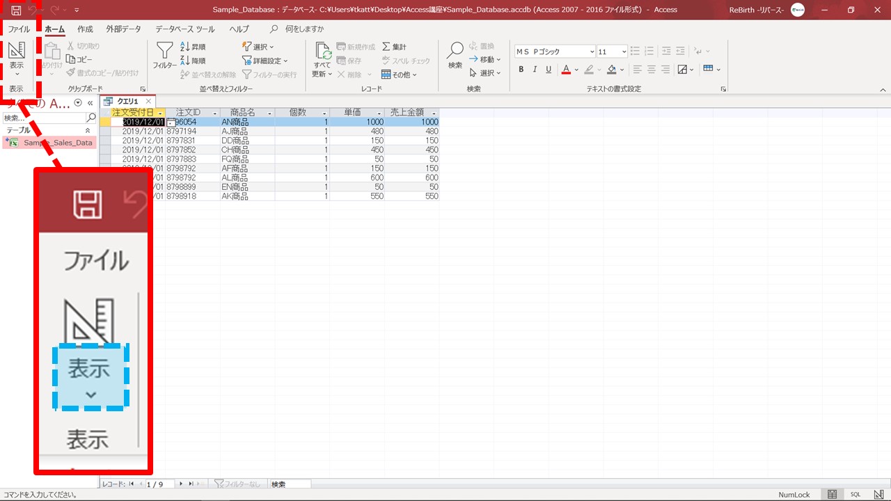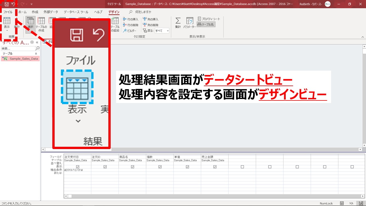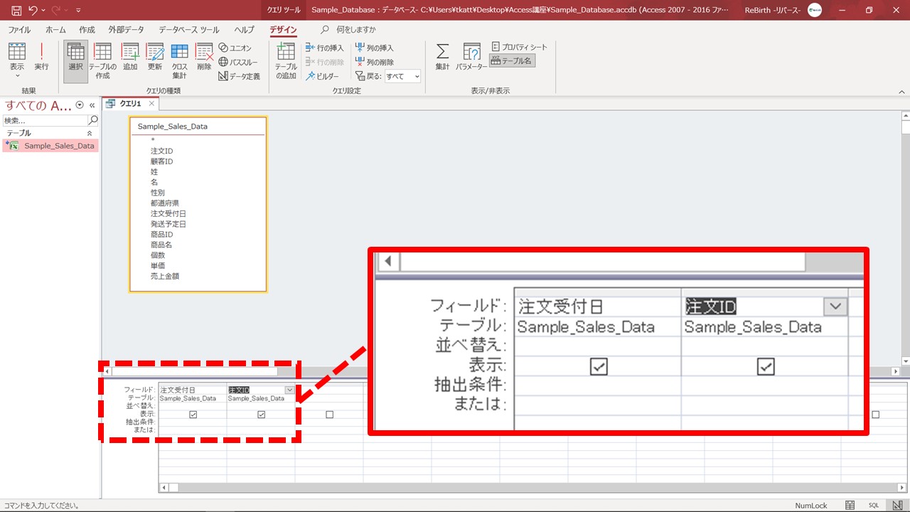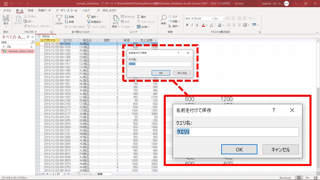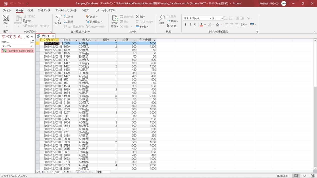 それでは、前回Excelデータをリンクさせた「Sample_Database.accdb」にクエリを作成していきます。
