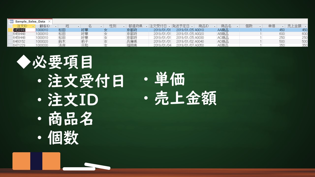 今回は、用意されたExcelデータより「指定された日の売上データを抽出する処理」をAccessで行い、その抽出されたデータをExcelデータとしてエクスポートします。
