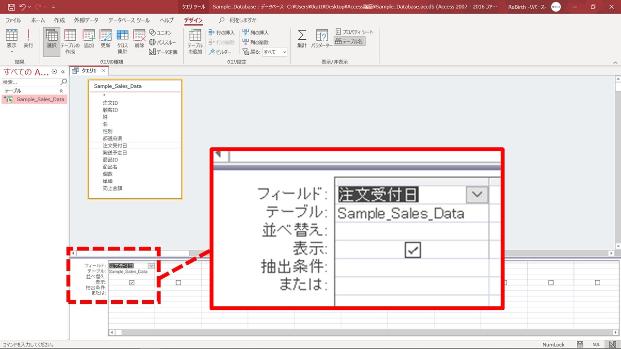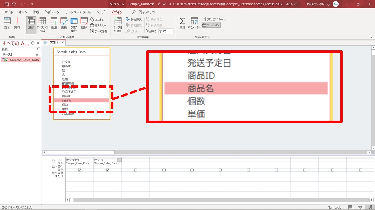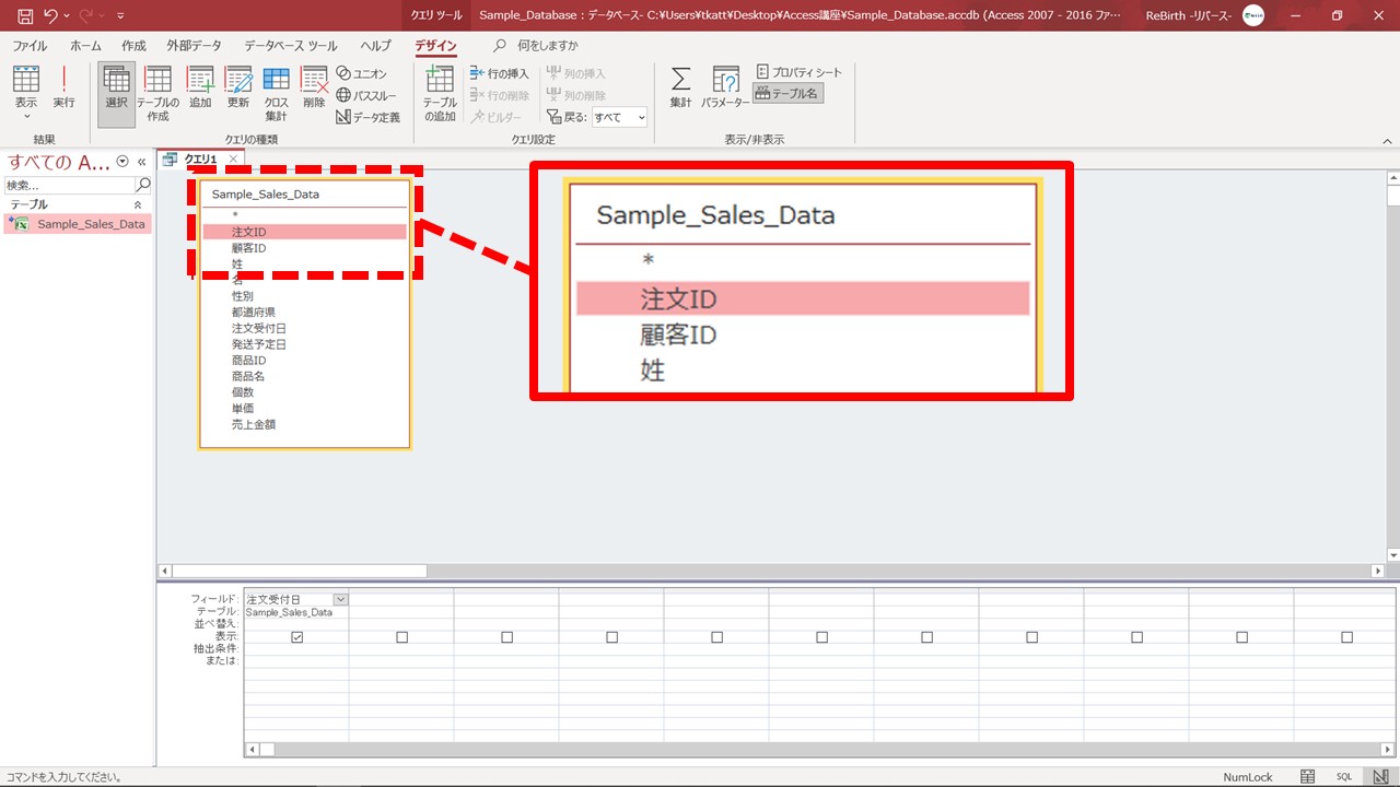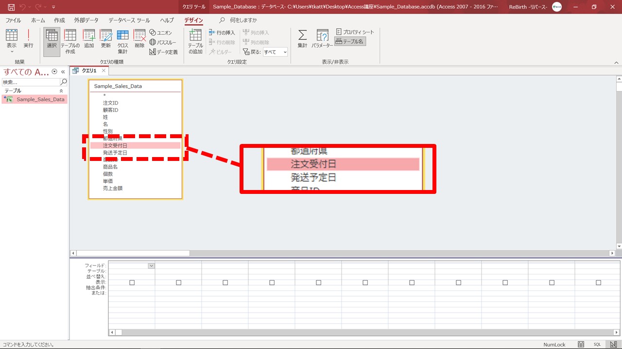 クエリ内にあるテーブルの[ 注文受付日 ]を選択し、ダブルクリックをしてください。