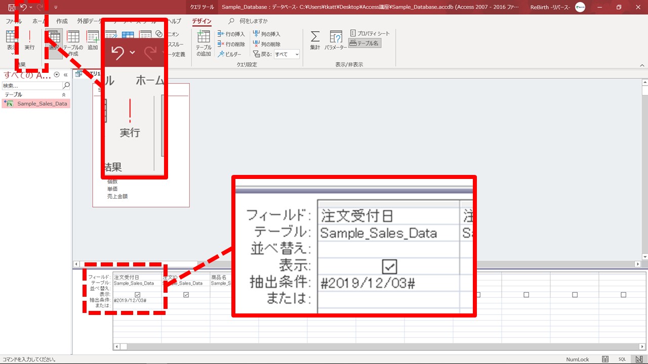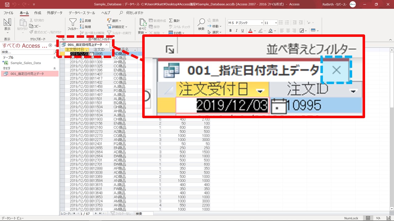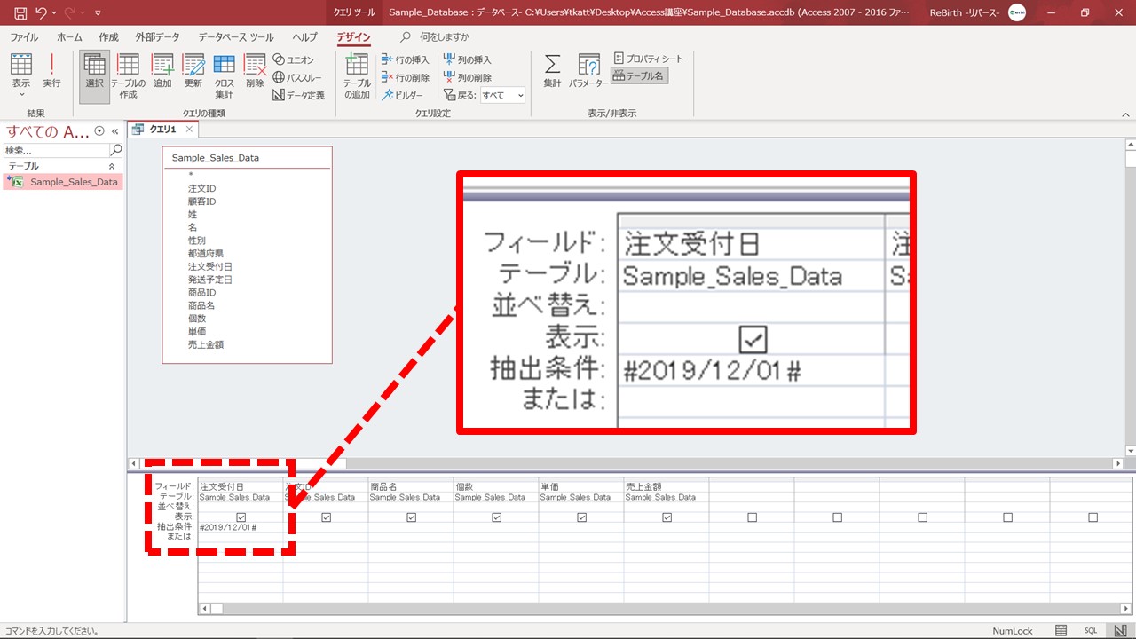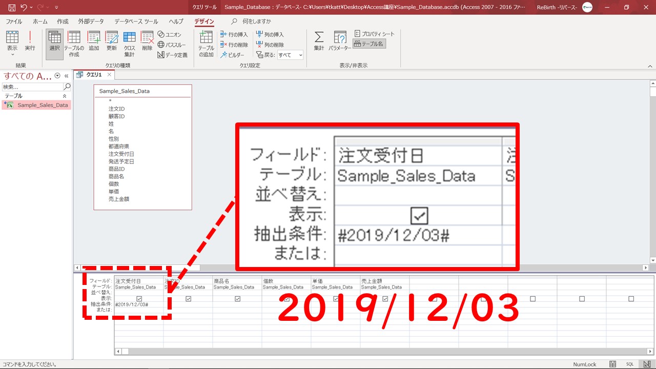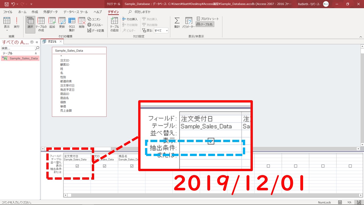 これで、「注文受付日が2019年12月1日のデータを抽出する」という条件が追加できました。もちろん、日付だけでなく、テキストの部分一致なども指定することが出来ます。Excelのフィルタ機能にある検索ならAccessでも対応できると考えても良いと思います。