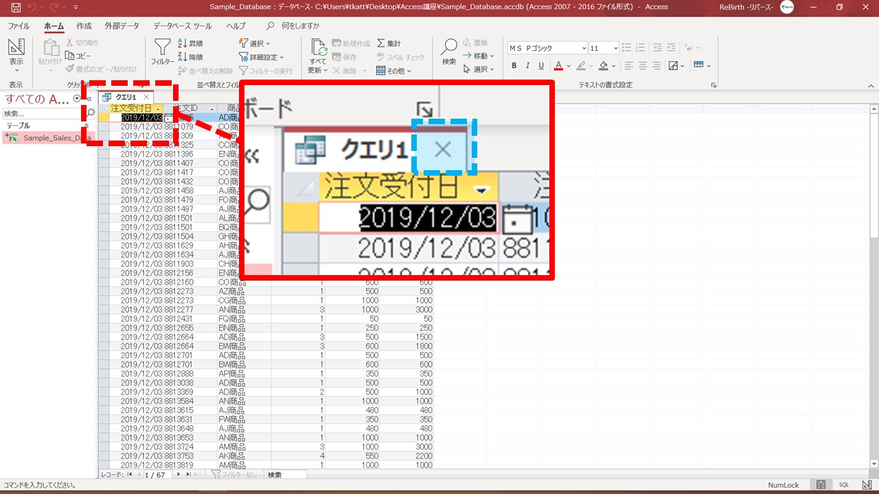 確認できましたら、クエリタブ横の[×ボタン ]で閉じておいてください。