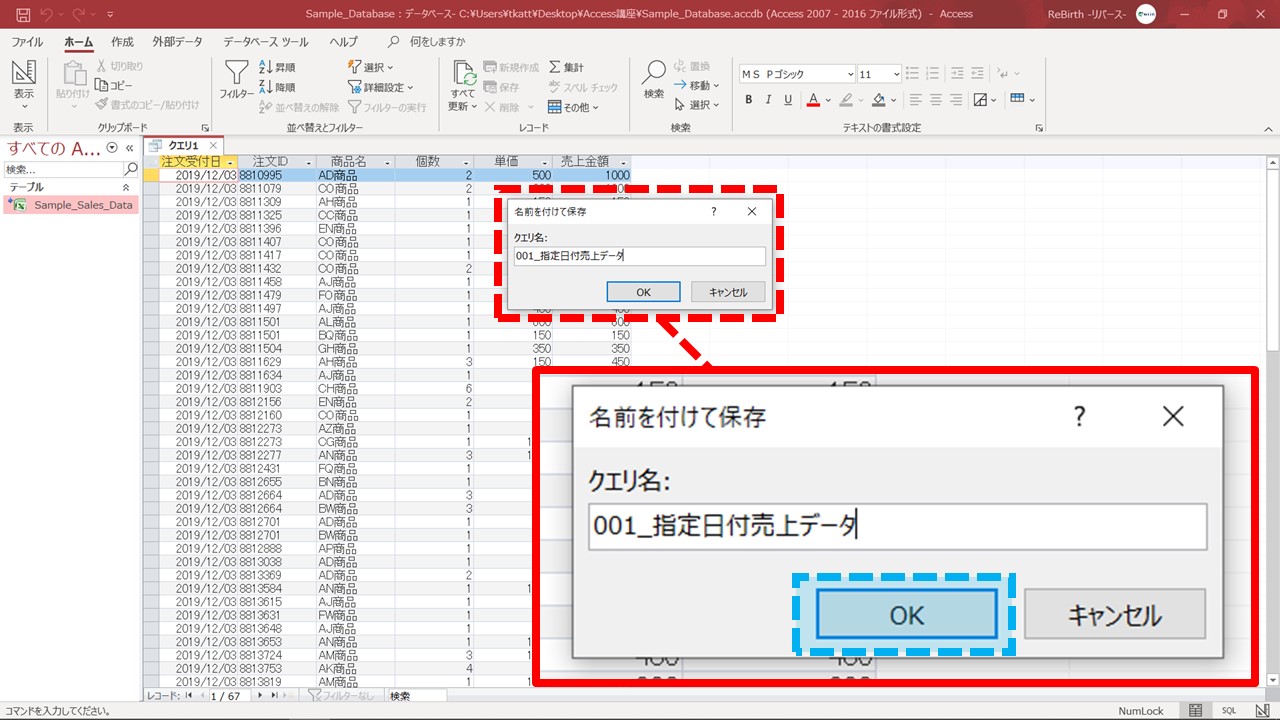 左側のウィンドウに、『 001_指定日付売上データ 』として保存されました。